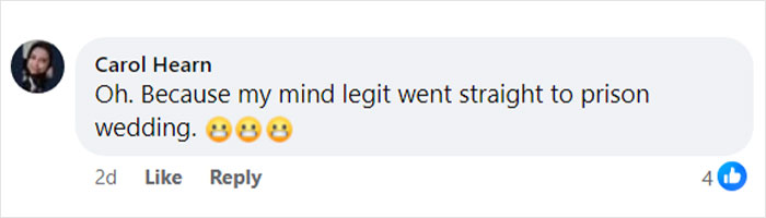 “This ain’t meant to be disrespectful at all, but is he an inmate? Just wondering how those types of weddings work. I’m only asking because of the location and outfit of his,” a Facebook user wrote under the photo of the outdoor wedding.