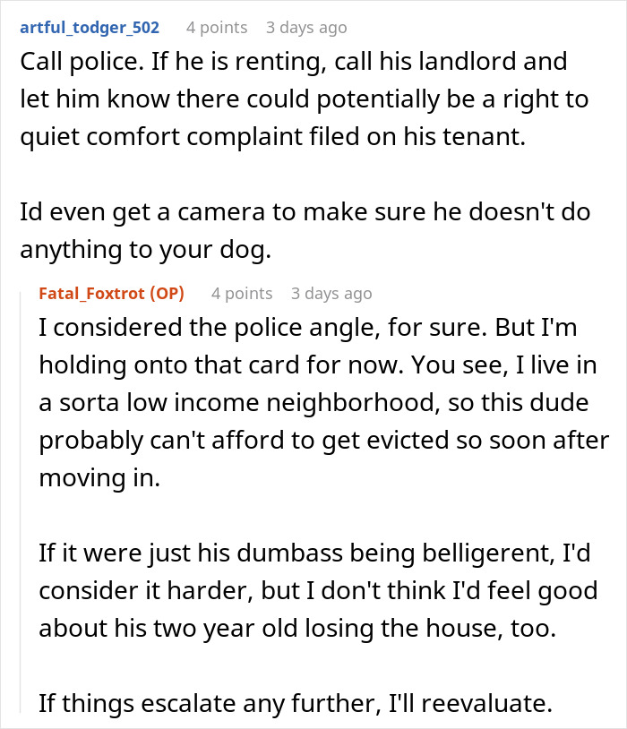 And yet others suggested possibly talking to the neighbor’s landlord if they’re renting. But OP responded that he does have that idea in mind in case the situation escalates. However, they live in a relatively poor neighborhood and the guy clearly can’t afford to be evicted.