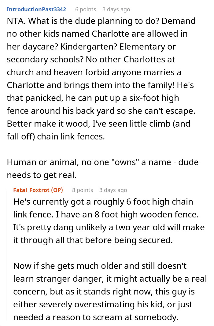 Others flipped the situation on its head for perspective—would it sound reasonable if OP suddenly started demanding the neighbor change his daughter’s name to something else? It sounds just as ridiculous.