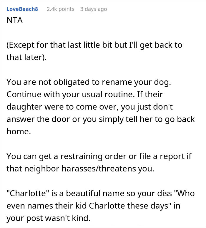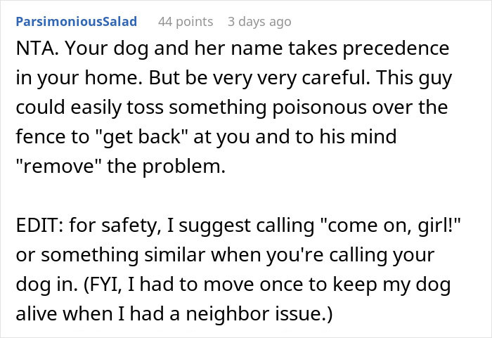 Well, one day, the new neighbor shows up at OP’s door and starts asking questions. Apparently, OP calling his dog over might also attract the attention and unsolicited visit of the neighbor’s daughter. To remedy this, he suggests renaming the dog.