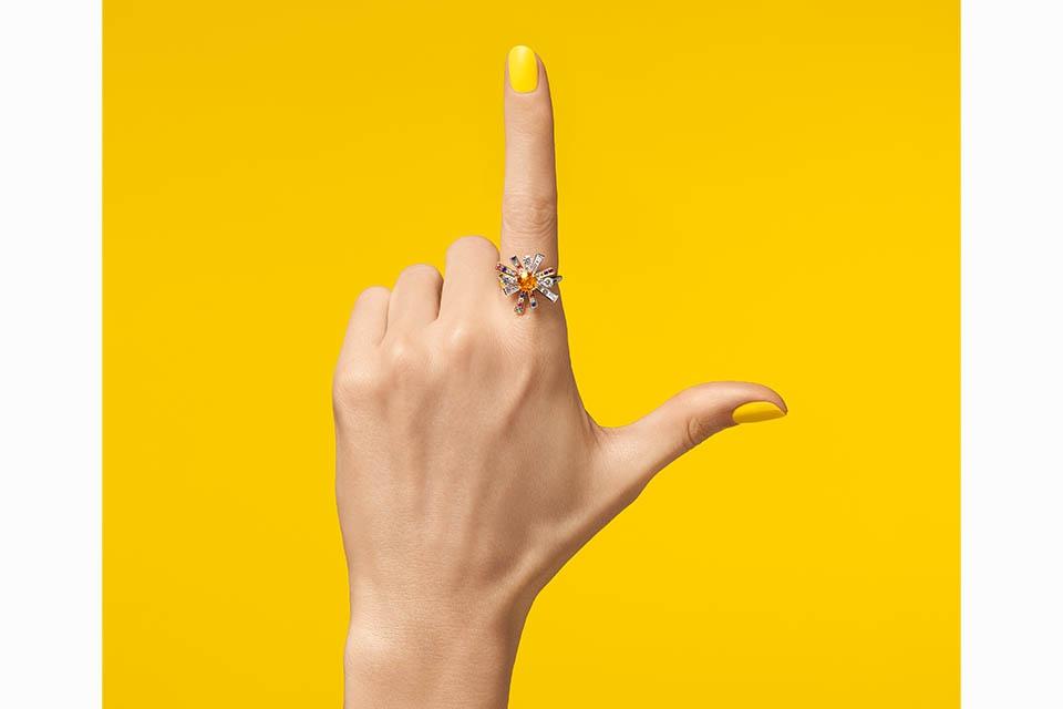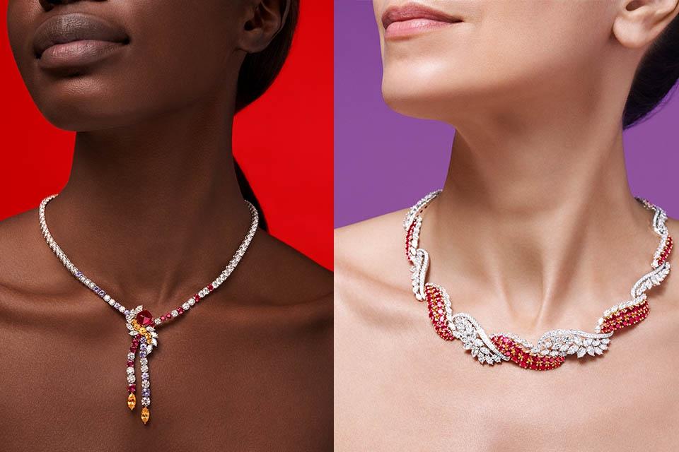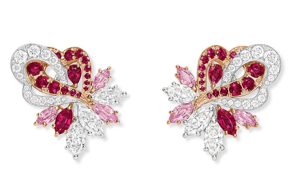 Next is Winston Vow, which celebrates commitment. However, you won’t find any traditional diamond engagement rings in this collection. Instead, Harry Winston focuses on hearts. The Dual Hearts earrings, necklace, and ring feature heart-shaped rubies accented with pear- and marquise-cut diamonds. The high-jewelry Promise suite also features heart-shaped rubies, but the designs are more intricate and include yellow diamonds and pink sapphires.