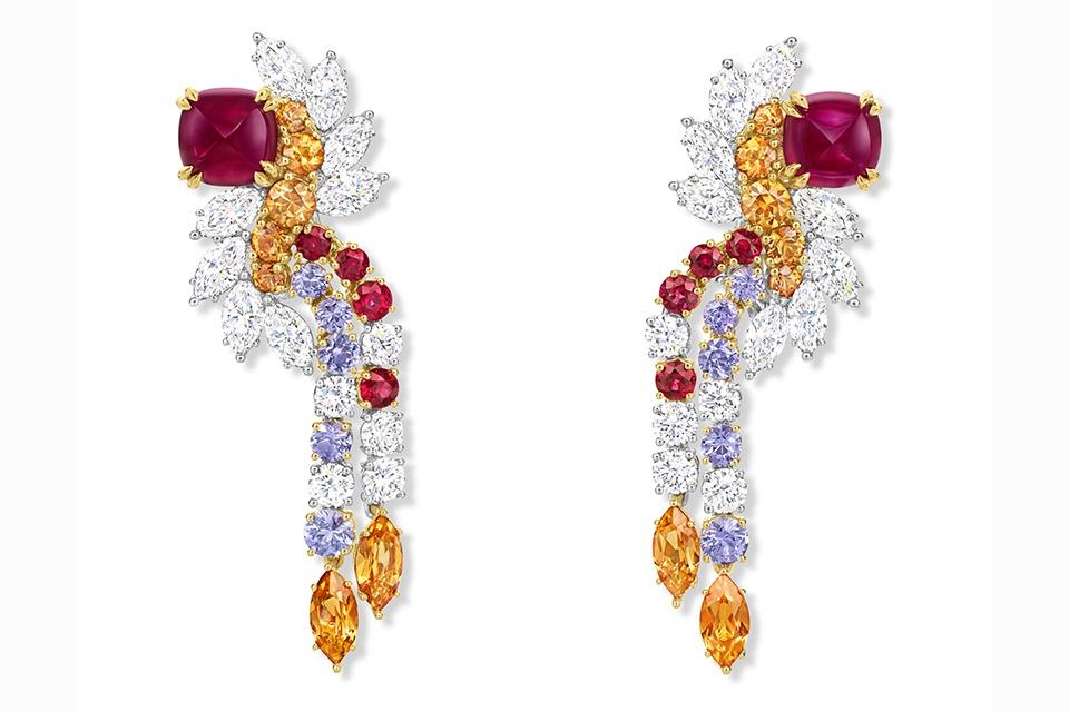 After the spark of new love comes Winston Obsession, a phase full of “burning passion.” The Dancing Flame series features two high-jewelry suites. A standout piece is beautiful chandelier earrings that showcase Harry Winston’s signature mix of gemstone cuts and colors. A sugarloaf ruby sits at the top of each earring, and diamonds, purple sapphires, orange spessartite, and rubies cascade from them. There’s a matching hair accessory, necklace, and ring.