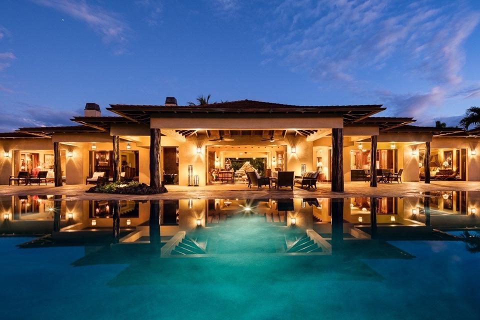 The 11,176 square foot residence features the best of indoor-outdoor living with massive moving glass walls that open to a variety of outdoor spaces, including a covered lanai, expansive lawn and an impressive arched infinity pool. Other highlights include a movie theater, golf simulator and massage spa.