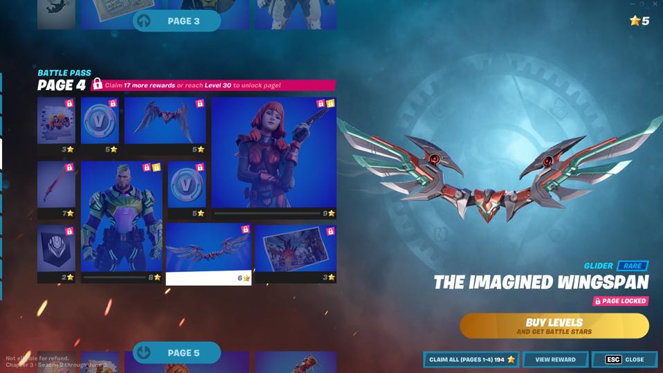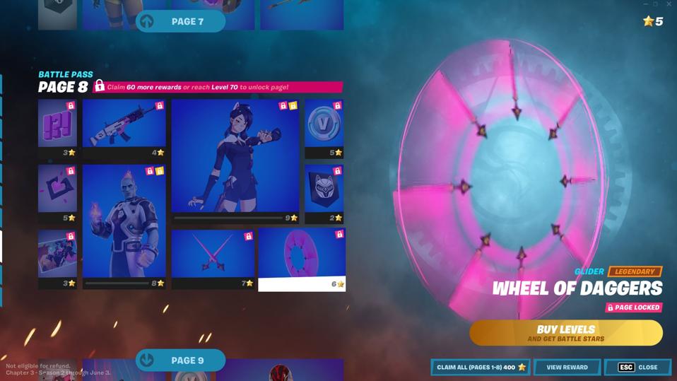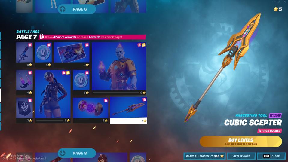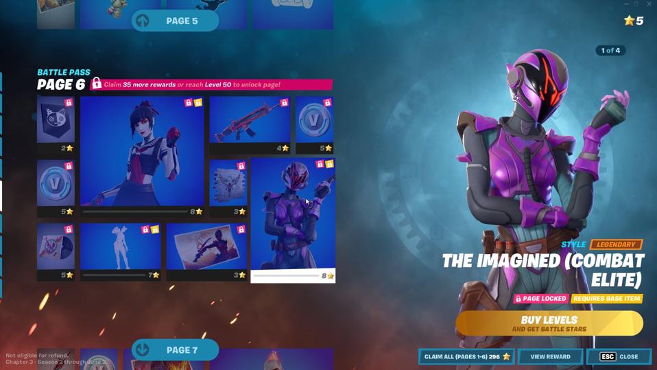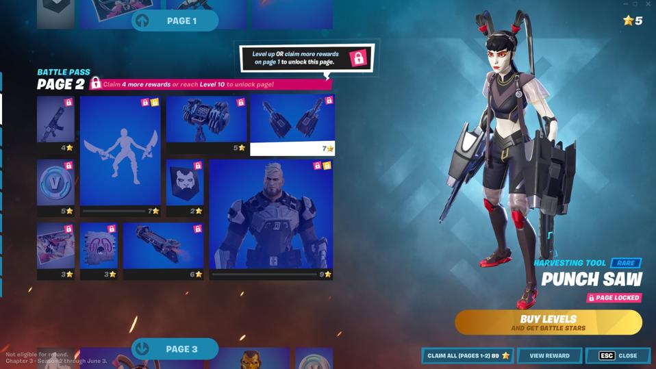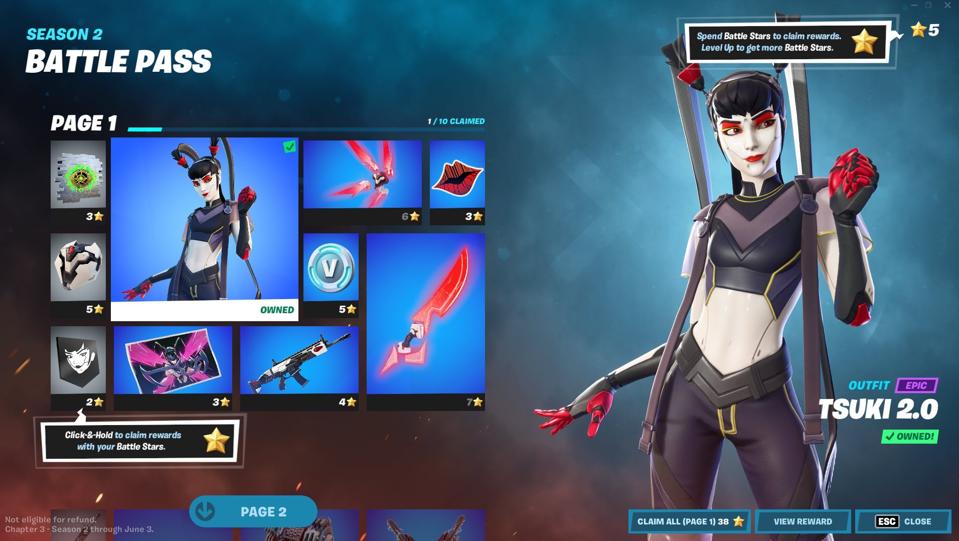 Page 1 – The skin that everyone gets this time around is Tsuki 2.0, an upgraded version of a robot skin that has become a Fortnite classic over the last stretch of time. She has back bling and her own weapons on this page as well that you can pick up. Tsuki has a special sword that you can “reprogram” to take different shapes and colors as you unlock currency for her.