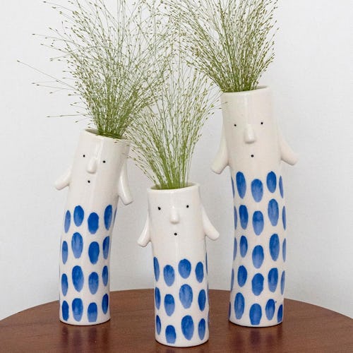 Give single roses or small bunches of greens a personality upgrade in the form of these bud vases. These quirky vessels feature tilted “bodies” and are complete with arms and faces that look just the right amount of shocked. Made from glazed ceramic, each vase is handcrafted.