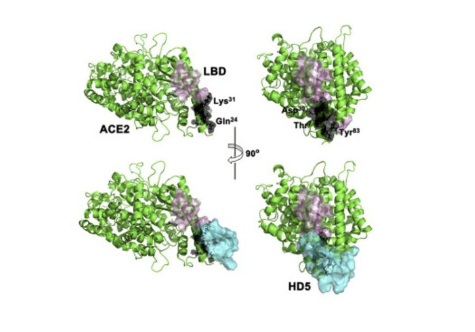 For this particular experiment, the researchers focused on human defensin-5 (HD5). This is the most common α-defensin secreted by intestinal Paneth cells and, as Wang et al. reported, is in close contact with the ACE2 receptors found in enterocytes, the most abundant epithelial cell of the intestines (Figure 2). The scientists discovered that HD5 can bind to the ACE2 receptors found on the surface of enterocytes. More specifically, they determined that HD5 attaches to and “cloaks” a part of the ACE2 receptors known as the ligand-binding domain (LBD) (Figure 3).