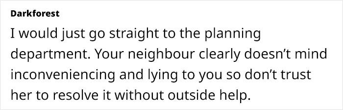 The woman’s next-door neighbor had given her one set of plans but had secretly gotten way more construction done. Her sneaky behavior continued when she got her builder access into the OP’s garden under false pretenses of making a small hole.