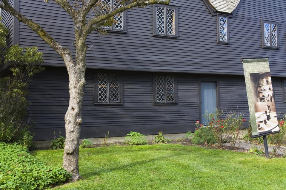 New England Colonial houses, built between 1600 and 1700, are simple, box-like structures framed with heavy timbers and organized around a massive, prominent chimney. Unlike Spanish Colonial buildings, which were based on grandeur, the New England Colonial house has its roots in humble, rural English architecture. Low ceilings and small windows attest to the challenges of staying warm in a New England winter. The well-known “salt box” shape extends the rear roof slope for additional interior space.