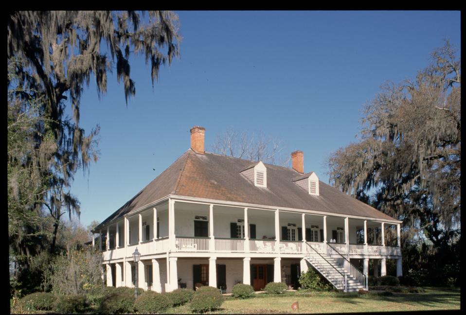 Southern Colonial houses, built at about the same time, are generally narrow buildings only one room deep and covered with a steeply pitched roof. Often built of brick, they reflect the need for less heat and more cooling ventilation; frequently, chimneys are at either end and there is a passage through the center of the house. Houses billed as “Southern Colonial” by realtors today usually feature white columns. They are variations of the Greek Revival style and have little, if anything, to tie them to genuine Southern Colonial architecture.