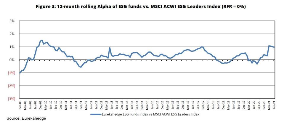 Eurekahedge also looked at the 12-month rolling alpha of ESG funds against the benchmark MSCI ACWI ESG Leaders Index. It found that ESG funds generated alpha against their benchmark approximately 70% of the time, especially between August 2012 through August 2018. During that timeframe, ESG hedge funds delivered consistently positive alpha against the benchmark.