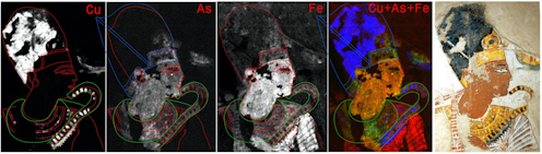 The paints and pigments used by the ancient Egyptians were made from minerals and as such, have specific chemical markers. Yellow, as an example, was achieved by grinding up the arsenic sulfide orpiment, whereas blue pigment could be created using hydrated copper chloride, and red with iron oxide. By using portable X-ray fluorescence, scientists can use these chemical markers in the pigments to create a map of damaged areas.