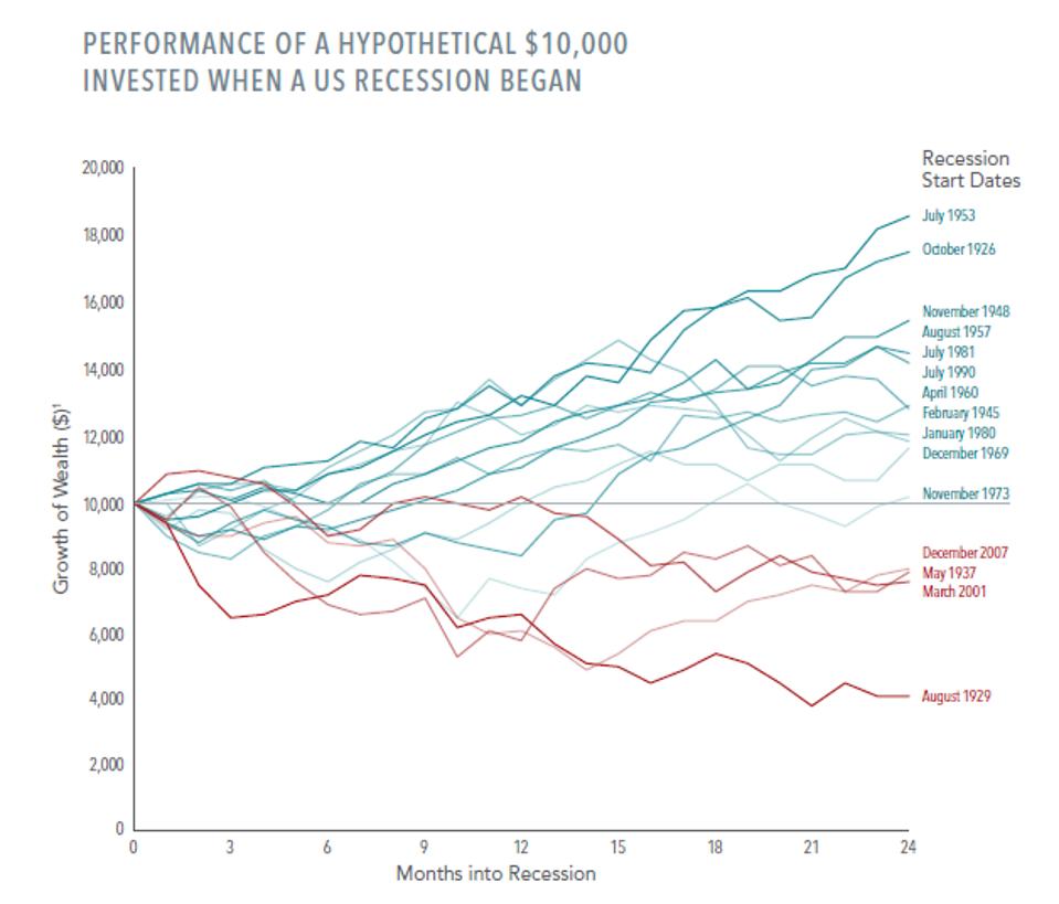 The takeaway: investors cannot predict what markets may do before, during, and after a recession. How stocks perform at any given time depends on many factors. So it's important to take steps to help prevent an economic downturn from having an outsized impact on your financial goals.