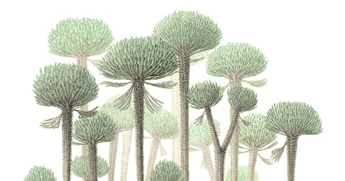 The picture that emerged of the earliest types of cladoxylopsid – by then recognised to be the first forms of tree to appear – was of a long tapering trunk, up to at least eight metres high, with distinctive short branches attached around the top to form a crown. From a distance, the trees would have looked like palms, with bases up to a metre in diameter. There were no leaves as such, just branched twig-like appendages which presumably had a photosynthetic function in the carbon dioxide rich atmosphere of those times.