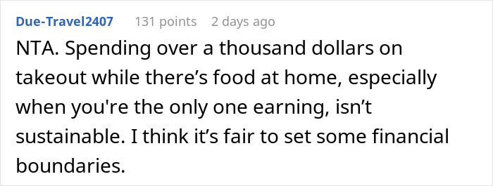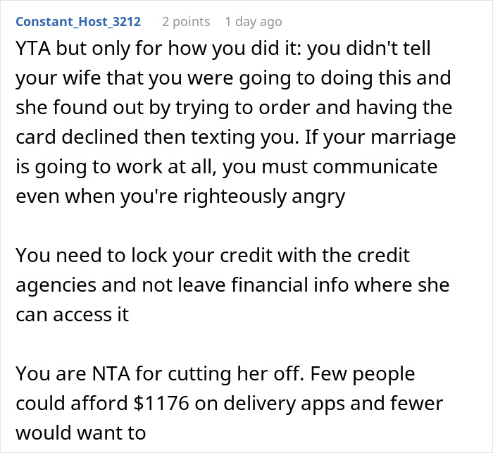 Recently, redditor Careful_Credit_4645 shared how his wife was guilty of doing just that. At first, she limited the food deliveries to twice a week but now it happens to be an almost daily occurrence. After seeing that she shelled out $1,176 of his earned money on takeout, he decided to take measures since they didn’t have the luxury to afford it.
