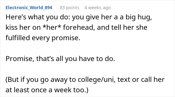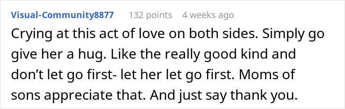 The commenters were almost as emotional about this story as the author himself. They encouraged him to go and tell his mom all about his feelings, eventually pushing him in the right direction. When he finally mustered up the courage to do it, he made an update about how they both talked, hugged, and cried together, making it the most wholesome ending to this heartfelt story.