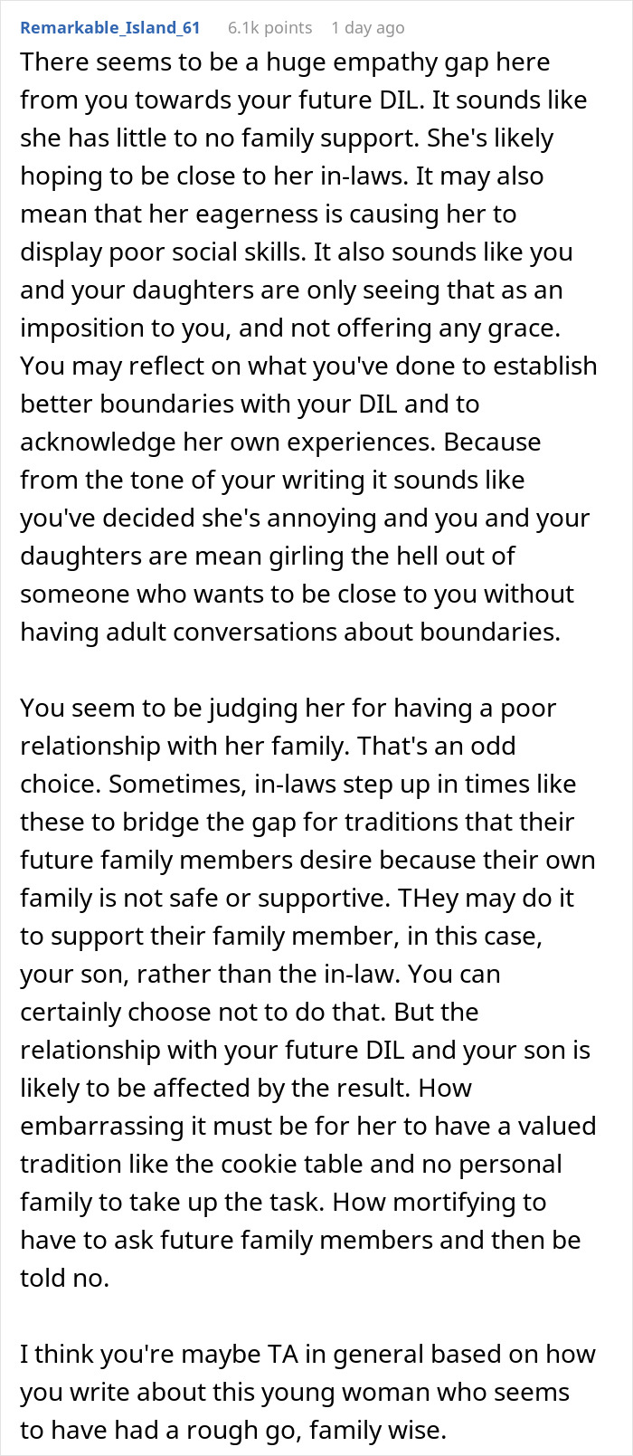 However, a significant part of commenters are quite sure that the issue here is not so much about cookies, but about relationships in the future family. “There seems to be a huge empathy gap her from you towards your future DIL. It sounds like she has little to no family support. She’s likely hoping to be close to her in-laws,” one person presumed. “Suck it up, apologize and offer to coordinate the cookie table. You’ll be glad you did,” another one advised.