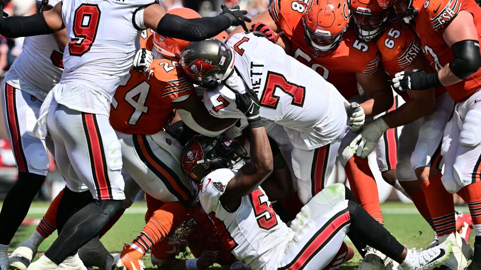On first down at the Bears’ six-yard line, Tampa Bay linebacker Shaq Barrett picked off a Justin Fields screen pass behind the line of scrimmage and, with an escort of large men pushing him like a stalled car, plowed four yards into the end zone.