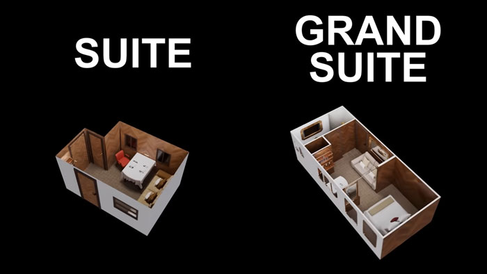 Upon entering the private room, the content creator revealed polished wood-paneled walls decorated with intricate designs. Inside was also an open living room with a couch, dining table, and large seat.