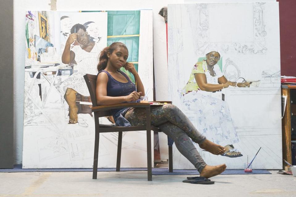 “There’s a market for art about women’s stories now” says Accra-based artist Afia Prempeh, “and you have to be aware of it.”. Speaking from her studio, Prempeh is making the finishing touches to a painting of a pregnant woman sitting on a chair by an open window. “It’s actually a sixteen year old girl” she clarifies, “I’ve known her for a while.”. The painting is one of ten canvases leaning against the walls. Another canvas shows a woman in luxurious evening wear with a stack of books behind her: “I like to paint the reality of women here in Accra” Prempeh says, “there’s such a breadth of experience, there’s no one story.”. Prempeh is in an exciting stage of her career: “I’m 35 years old and I feel like I’m finally getting the audience my work deserves”, she says.