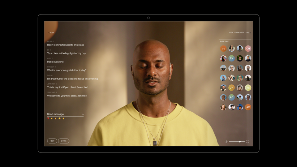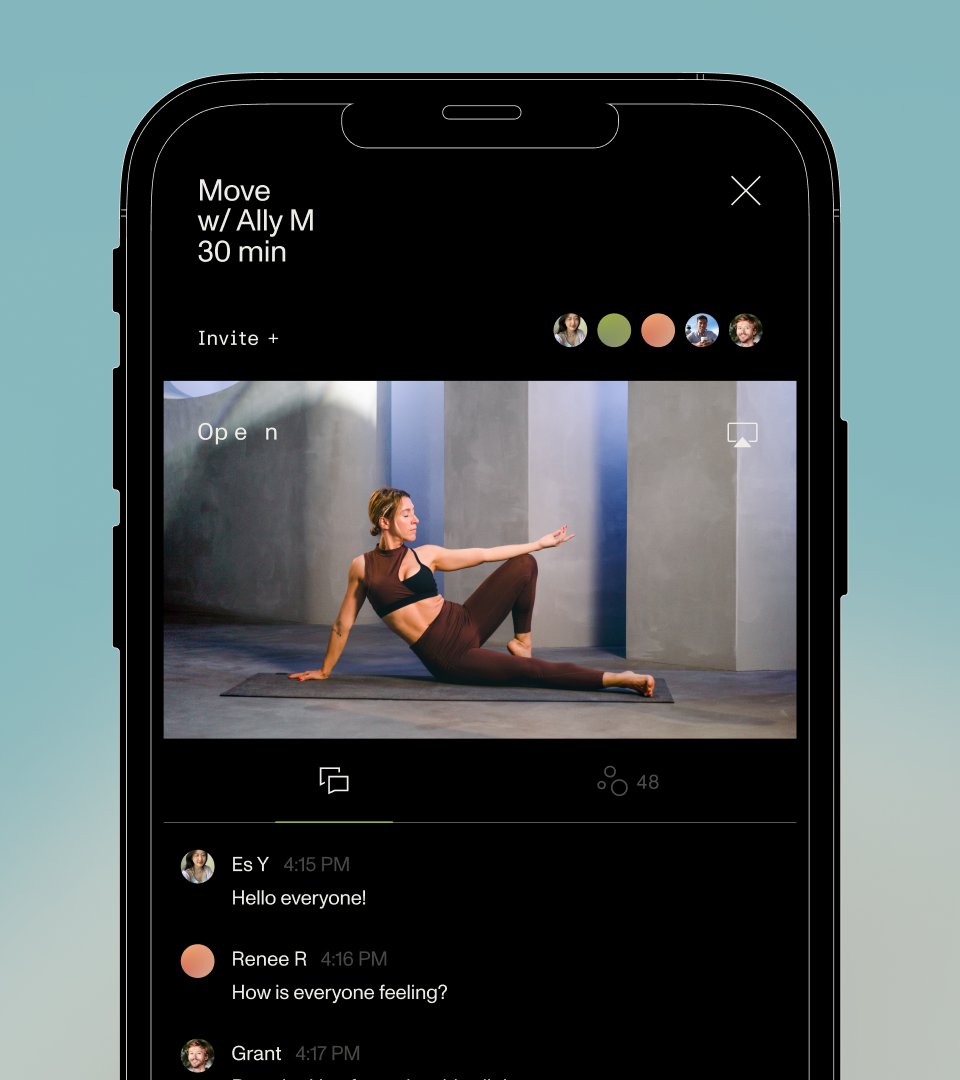 The studio delivers the most immersive audio and visual experience for Livestream, on-demand and in-person classes, designing digital and physical spaces to facilitate community and presence for all levels. Practicing together is core to Open’s ethos. Open has developed features to connect users and teachers, such as in-class live chats, groups of friends, synchronous meditation and breathwork sessions, the ability to turn on your camera and view others while practicing—all to encourage presence through connection. To create broader access, Open offers free guest passes; subscribers can (virtually) bring friends to classes in a group by sending a link. Additionally, Open offers in-person classes at their studio in Venice, facilitating presence, together.