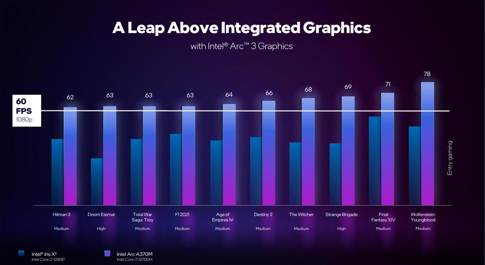Before we look at some features that will benefit content creators, let’s take a quick look at Intel’s internal benchmark results for Arc 3 graphics, the lower-performance tier that aims to deliver solid 1080p gaming. These are from a test system with an Intel Core i7-12700H CPU and Intel Arc A370M GPU.