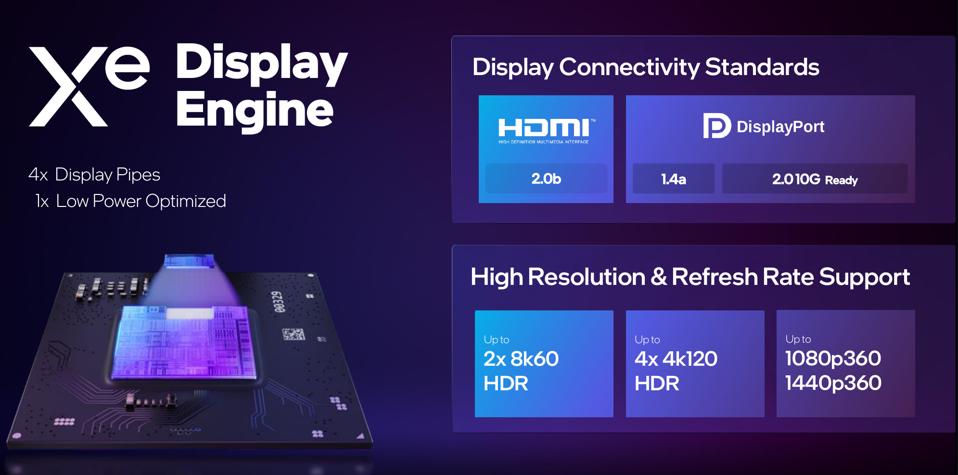 Intel’s Xe Display Engine makes a mockery of this by using HDMI 2.0b and DisplayPort 1.4a. In practice, here’s the kind of display support you can expect to be supported now and in the future with Intel Arc: