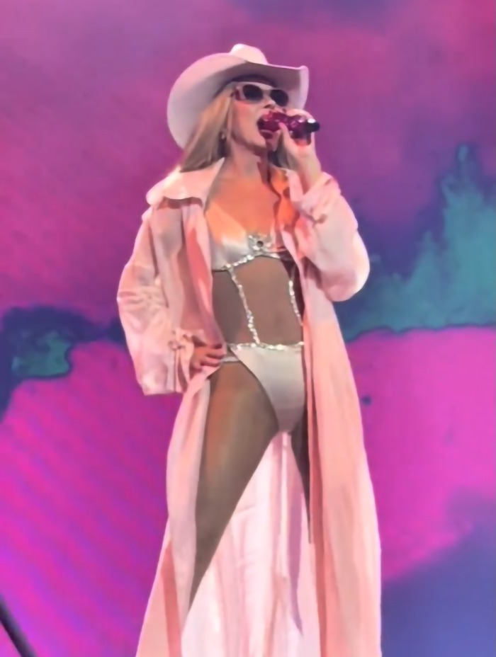 During the show last week, the 59-year-old singer wore a revealing two-piece set and a long pink jacket on top with a matching cowboy hat, but the bold look didn’t sit well with everyone.
