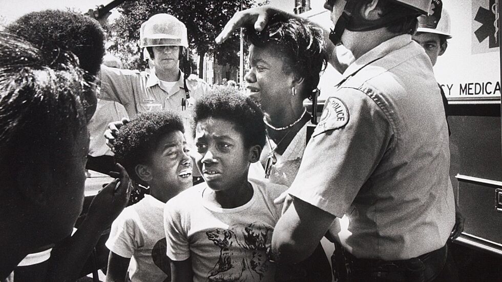 Mr. Frost’s daughter Shelley Groh remembers talking to her dad about images he captured of a cop protecting a Black mother and her children with his shield from projectiles being tossed at them by neo-Nazis who’d gathered in Marquette Park in 1978.