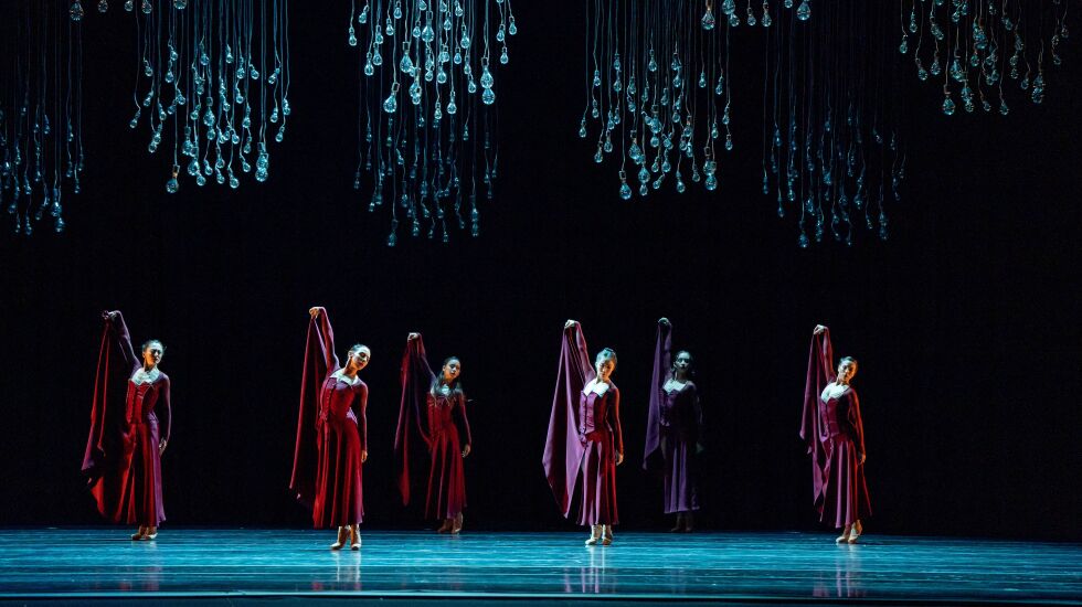 Rounding out the program is a revival of “Vespertine” by Liam Scarlett, who was a kind of dance-world wunderkind before he tragically took his own life in 2021 at age 35. Inspired by the chiaroscuro paintings of Caravaggio, this work takes place on a shadowy stage lit with 13 globe-like chandeliers, with the dancers entering and exiting dramatically via the darkness at the back of the stage.