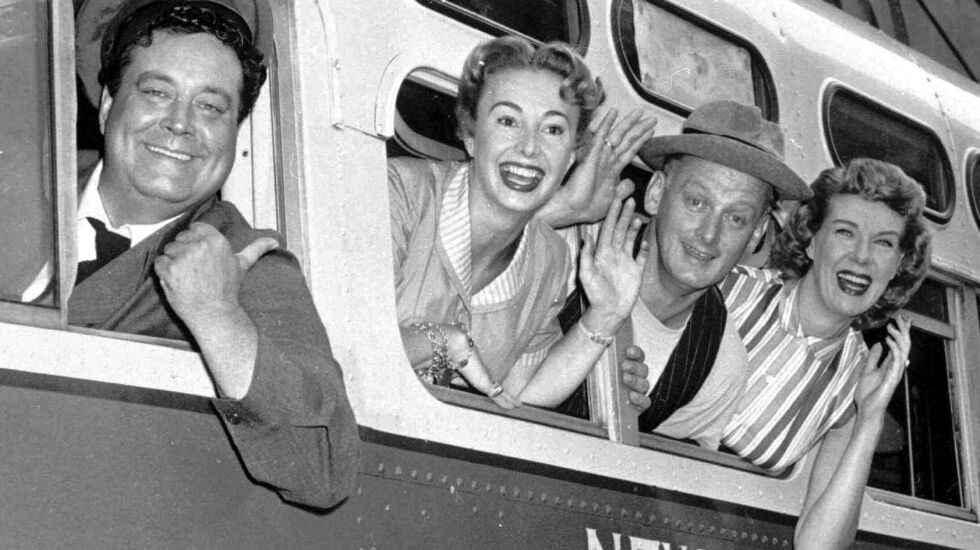 “The Honeymooners” was an affectionate look at Brooklyn tenement life, based in part on star Jackie Gleason’s childhood. Gleason played the blustering bus driver Ralph Kramden. Audrey Meadows was his wisecracking, strong-willed wife Alice, and Art Carney the cheerful sewer worker Ed Norton. Alice and Trixie often found themselves commiserating over their husbands’ various follies and mishaps, whether unknowingly marketing dogfood as a popular snack or trying in vain to resist a rent hike, or freezing in the winter as their heat is shut off.