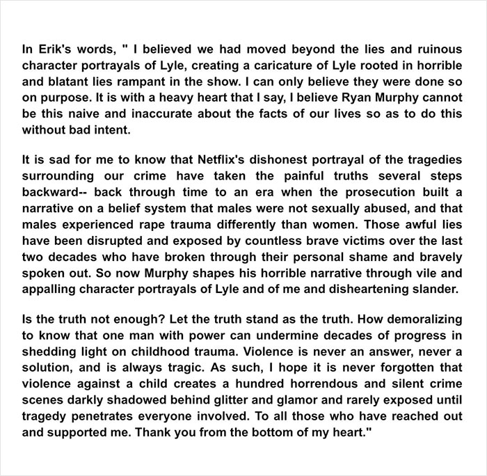 According to the statement shared by his wife, Erik went on to slam the series creator, Ryan Murphy, adding: “It is sad for me to know that Netflix‘s dishonest portrayal of the tragedies surrounding our crime have taken the painful truths several steps backward—back through time to an era when the prosecution built a narrative on a belief system that males were not sexually abused, and that males experienced rape trauma differently than women.”