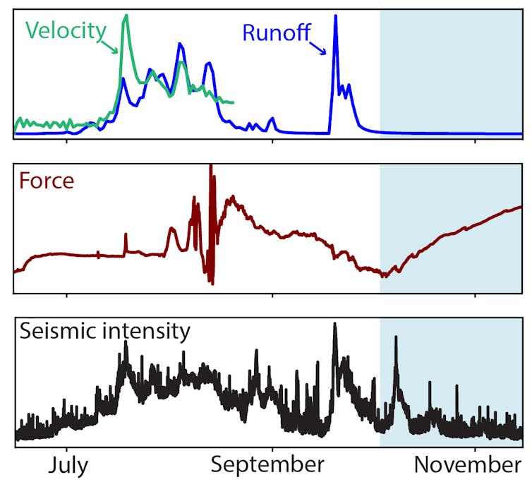 All this water lubricates the base of the glacier and causes an increase in the velocity and stresses inside the glacier. At the same time, we measure an increase in the intensity of glacial vibrations, related to hydrological noise and intense crevasse activity under the influence of summer heat and glacier acceleration. This summer we observed an increased presence of crevasses and measured an increase in stress compared to last year. This could be a sign of a strong acceleration or even destabilisation of the glacier.