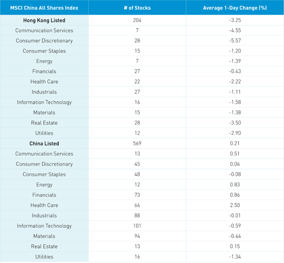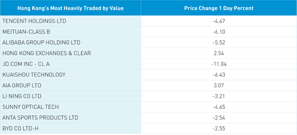 The Hang Seng Index was off -3.88% intra-day before an afternoon rally curtailed losses at -1.61% as volume surged +30% from yesterday, which is 128% of the 1-year average. Decliners outpaced advancers 3 to 1. All sectors were off with financials down the least as the Hong Kong Exchanges gained +2.54% as a beneficiary of the HFCAA. Tencent, Meituan, and Kuaishou were bought in size from Mainland investors via Southbound Stock Connect. Healthcare was weak due to three of the five stocks identified by the SEC happening to be biotech stocks.