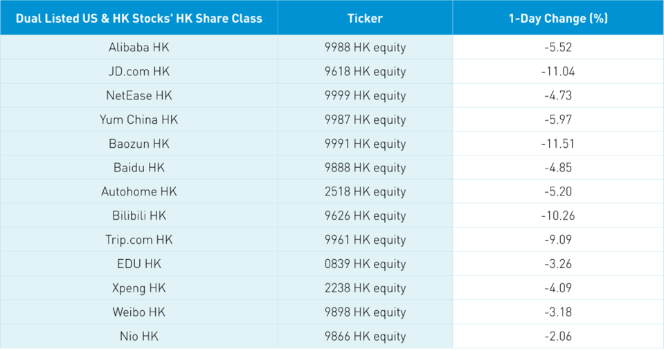 Hong Kong investors were fairly less pessimistic as US-China ADRs were down -10% while the Hang Seng Tech Index was down -4.28%. YUMC and BGNE fell -10.94% and -5.87% yesterday though their Hong Kong shares fell -6.02% and -4.96%. This was true for internet stocks as JD.com’s US shares fell -15.83% versus HK’s -11.08%, Alibaba US fell -7.94% versus HK’s -5.56%, Baidu US -6.29% versus Baidu HK -4.9%.
