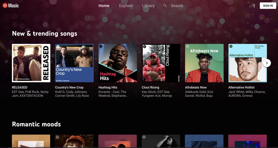 Explore is where users can see new releases, look at top song and album charts, find music by mood or genre and check out trending titles, as well as new music videos. Library is where user-created playlists are saved. If you subscribe to artists’ YouTube channels, you will also see them in the “subscription” tab in your Library.