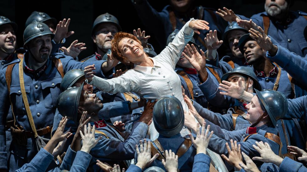 The French-language opera’s central comic gambit is simple and wonderfully absurd: A female foundling, Marie (soprano Lisette Oropesa), has been adopted and raised by an oafish yet lovable regiment of French soldiers. She irons and peels potatoes as she sings some of her most important arias.