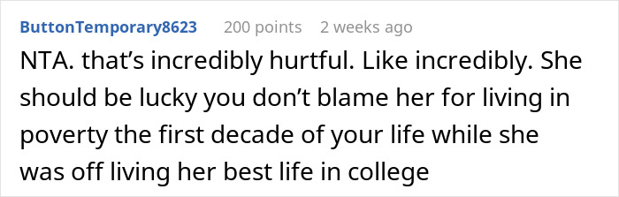 The poster did mention that he has a good relationship with his mom now as a 24-year-old. Earlier on, when she had him at 16, she was not in the right financial and emotional space to be able to look after him. Luckily, her parents took on the responsibility despite being in poor financial circumstances. That’s why she was able to go and finish her college education.