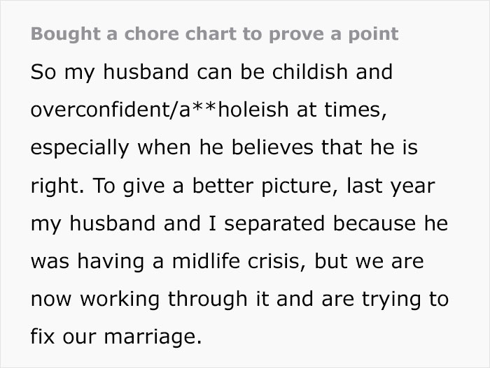 If a couple can’t agree on the allocation of chores, their conflicts can cause resentment and tension that damages the entire relationship. So when Reddit user 4eversoulsraven realized that her husband wasn’t planning to stop complaining about her share of housework, she decided to illustrate the big picture in a way he couldn’t argue with. As the woman explained on the subreddit ‘Petty Revenge,’ she bought a chart and started tracking everything that she was doing, making it clear just how much effort she was putting into maintaining their home.