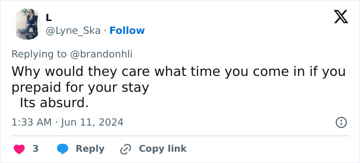 “I message the host to escalate,” Brandon wrote, to which the host allegedly replied: “Too bad. You missed your check-in window.”