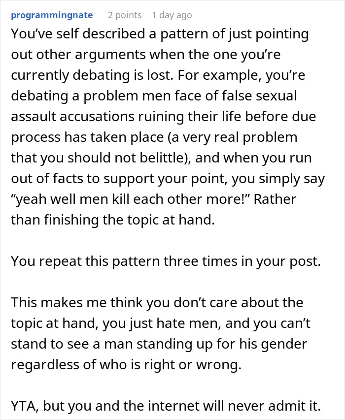These are just US statistics, but broadly speaking, men commit vastly more violent crime. One global study suggested that men are responsible for 95% of murders in the entire world. It’s almost surprising that the average person isn’t more scared of a random man they encounter. His beliefs are immature, misguided, hypocritical and she shouldn’t just leave him, she really should run.