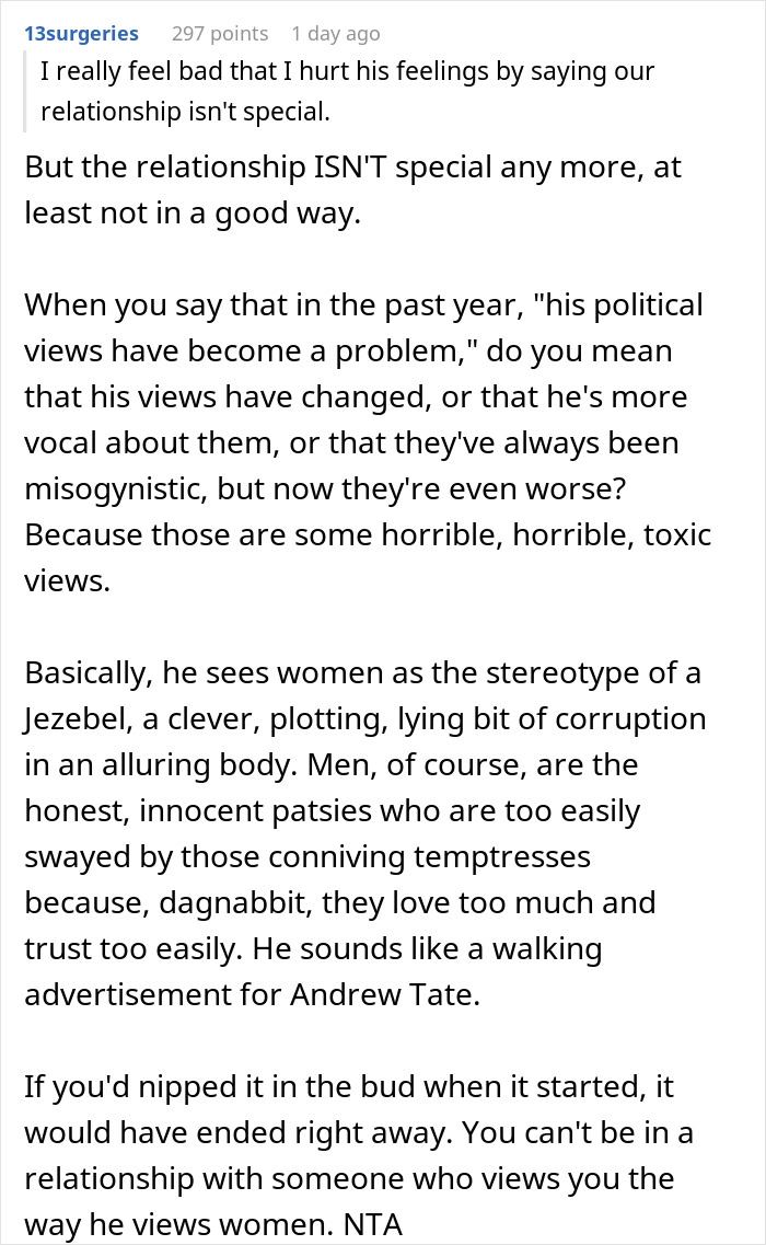 But one woman grew exhausted from the horrible things her fiancé kept saying about women