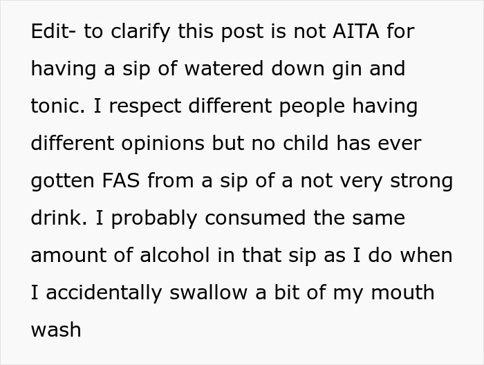 Yet, these comments can’t compare to the drama this wannabe work-wife caused at their boss’s garden party. During it, the original poster’s husband was having a glass of gin and tonic. Since it is one of the woman’s favorite drinks, she asked him for a small sip. Typically, in this drink, the gin is mixed with tonic water and ice, so it isn’t straight alcohol. And so, a tiny sip isn’t that threatening to a pregnant woman.