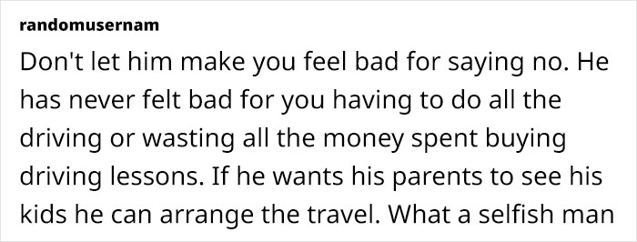 Folks online found it really strange that he refused to even discuss it with her and they said that he should use public transport to take the kids to his mom and not make her drive
