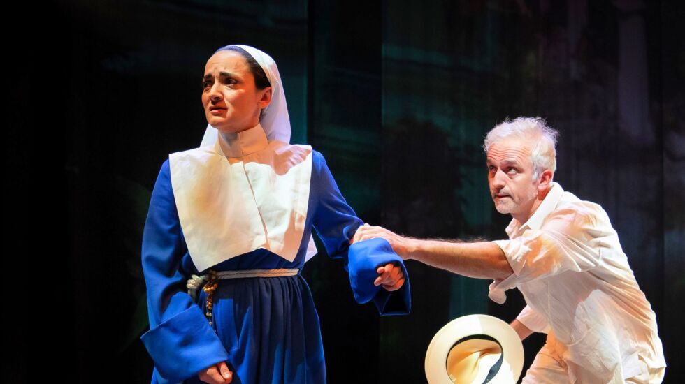 Claudio’s only hope of a pardon comes in the form of his sister Isabel (Cruz Gonzalez-Cadel), a novitiate in a cloister where the nuns all are forbidden to so much as look at a man once they’ve taken their vows. Isabel pleads for Angelo to spare her brother’s life and, miraculously it initially seems, Angelo agrees. Then he states the price: Isabel’s virginity. She’s not willing to pay. Gonzalez-Cruz captures both the piety and the extremity of Isabella’s own morality: he’d lay down her life for her brother, Isabel says in one of Shakespeare’s most complicated takes on passion and principle, but she won’t lose her virginity to save him.