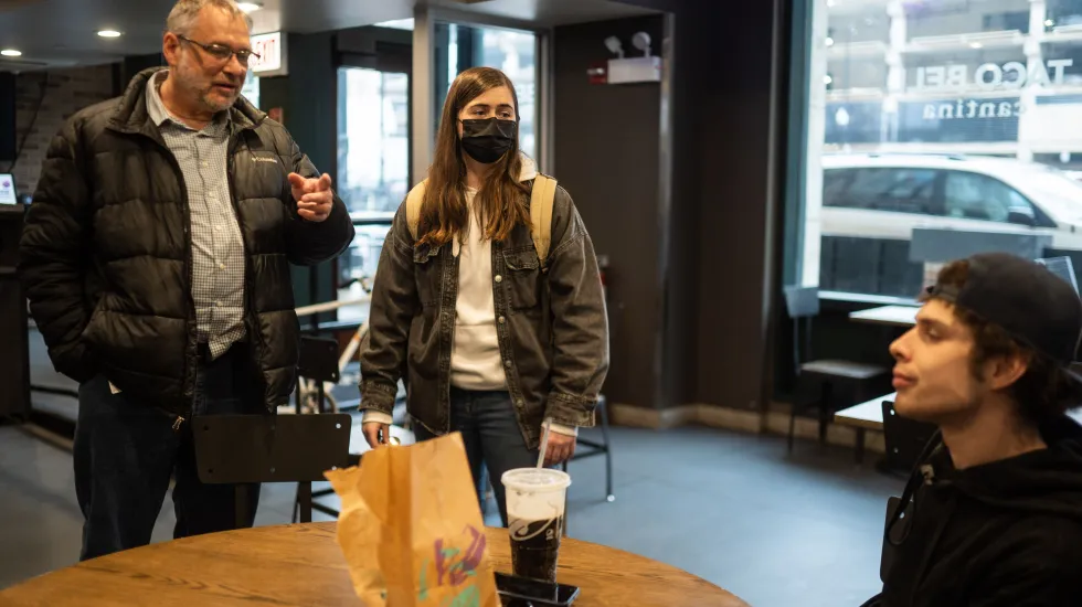 He continues, blending near-poetry and conspiracy theories, wild claims and philosophical riffing, as Billitteri, a caseworker at Thresholds, gently steers him out of the rain and into the restaurant, where she buys him a Taco Supreme (“If you could bless me with extra sour cream on the side,” he says) and tries to get Edgar to sign a form to help him get off the street and into housing. Where he sleeps now, he says, is “classified.”