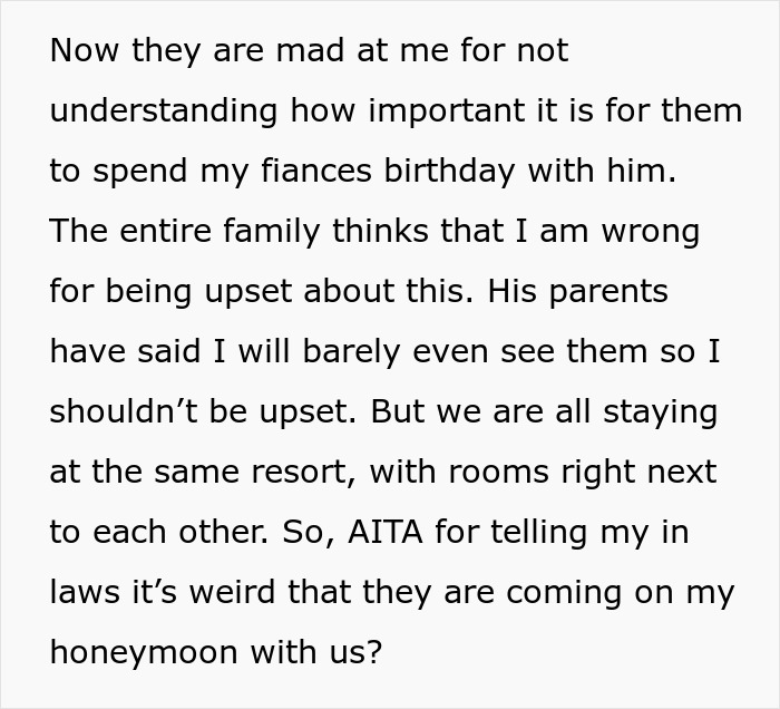 Commenters to the original post also noted that in the current situation, everything is very complicated, and that everyone is right in their own way. “I get that this is supposed to be your honeymoon and therefore don’t want the in laws around,” one of the responders wrote. “But if I’m reading this right you are getting married around your husband’s bday and as such will be gone on his bday, and his parents want to spend what might be his last bday with him.”