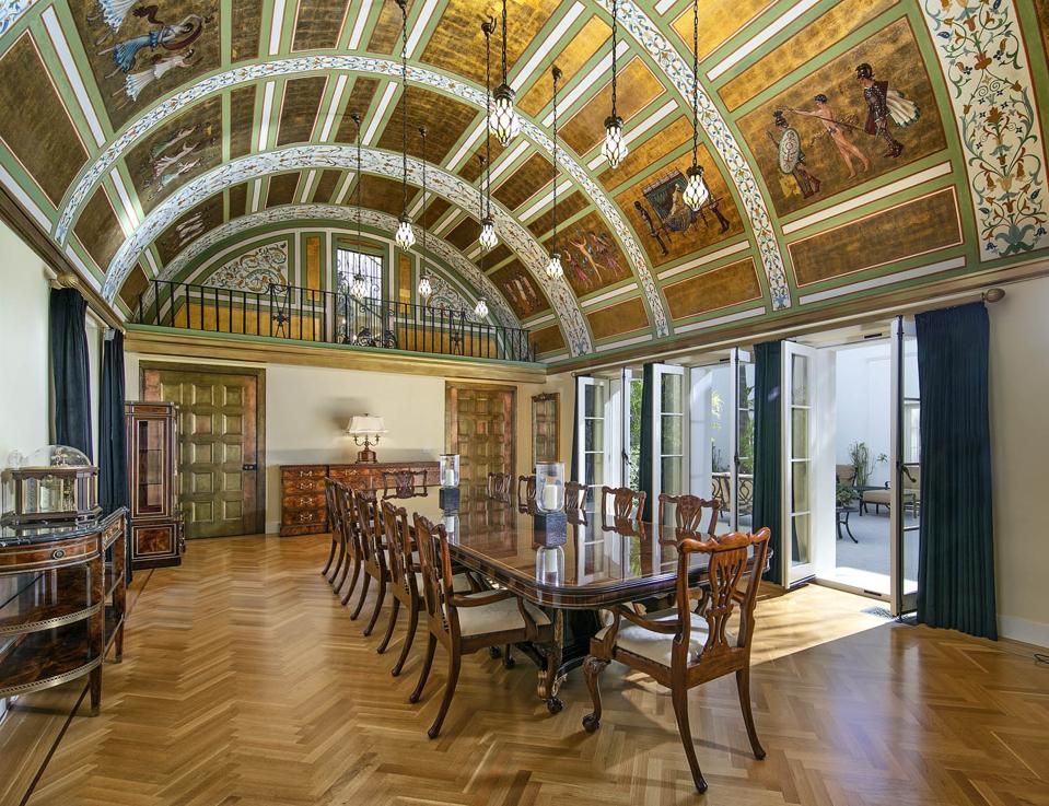 The air of old-world regality can also be found in the mansion’s massive dining room, whose barreled ceiling displays a scene in 24-karat gold leaf painting of Alexander the Great conquering Persepolis.