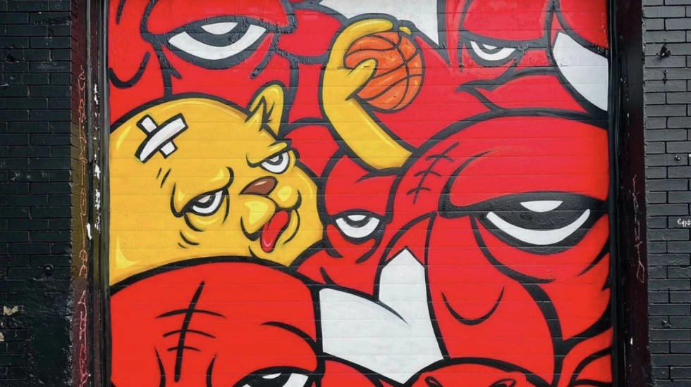 The Wicker Park resident also likes painting Bear Champ so he sticks out from a pattern. He similarly painted a mural in Humboldt Park last year where the character was surrounded by bulls — angry-looking red ones like the Chicago Bulls logo. The Bear Champ in that instance gripped a basketball and had his tongue sticking out — an homage to Michael Jordan and the 1996 champion Bulls squad.
