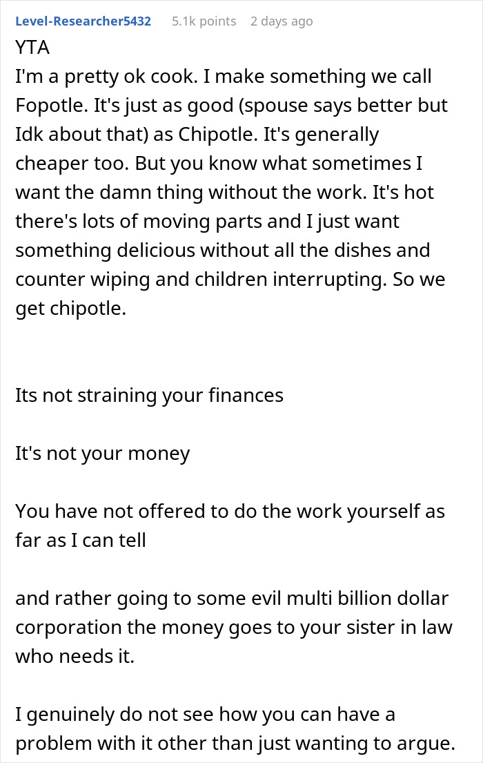 The husband did none of those things. Instead, he kept forcing his wife to curb her burger expenses and cook up a batch at home. People were annoyed by his stubbornness and pointed out that his wife probably wanted to relax and eat something fancy once in a while. She also wanted to do something nice and support her sister. Hopefully, the OP’s silence in the comments section indicates that he learned his lesson.