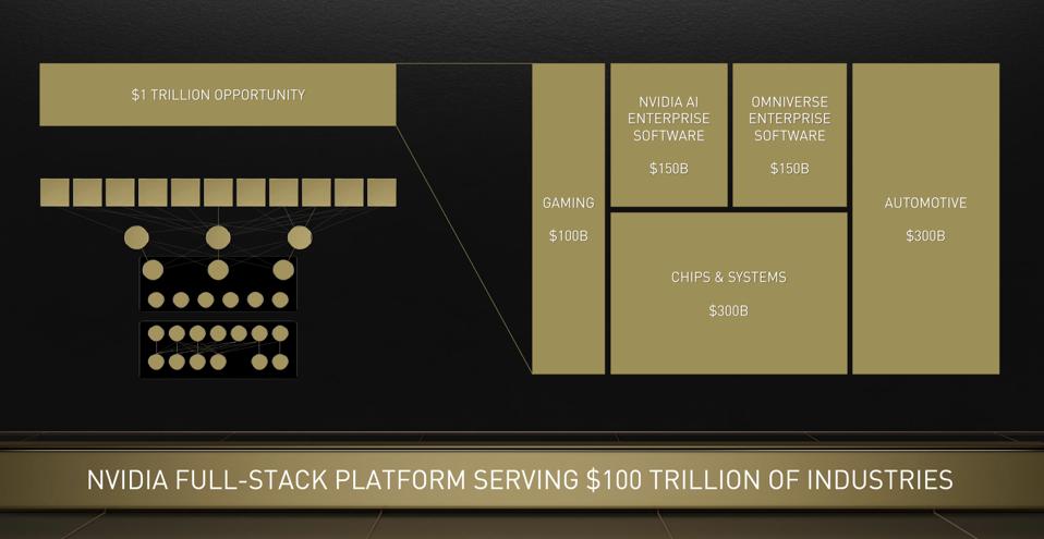 At GTC, NVIDIA announced an impressive new lineup of chips, software, and networking products designed to expand its mission as the go-to supplier for cloud infrastructure.. This included NVIDIA’s presentation to investors, which plotted a total addressable market (TAM) of $1 trillion with software and hardware products in markets such as AI, enterprise automation, and autonomous vehicles (see chart below).